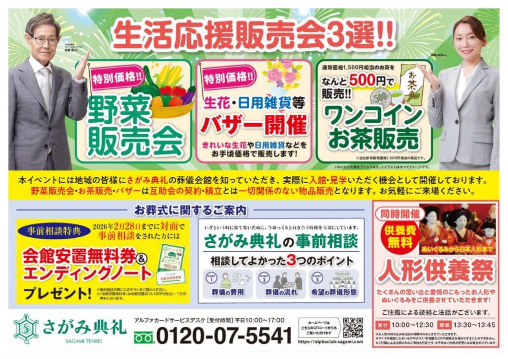 野菜販売会・お茶販売・バザーは互助会の契約・積立とは一切関係のない物品販売となります。お気軽にご来場ください。